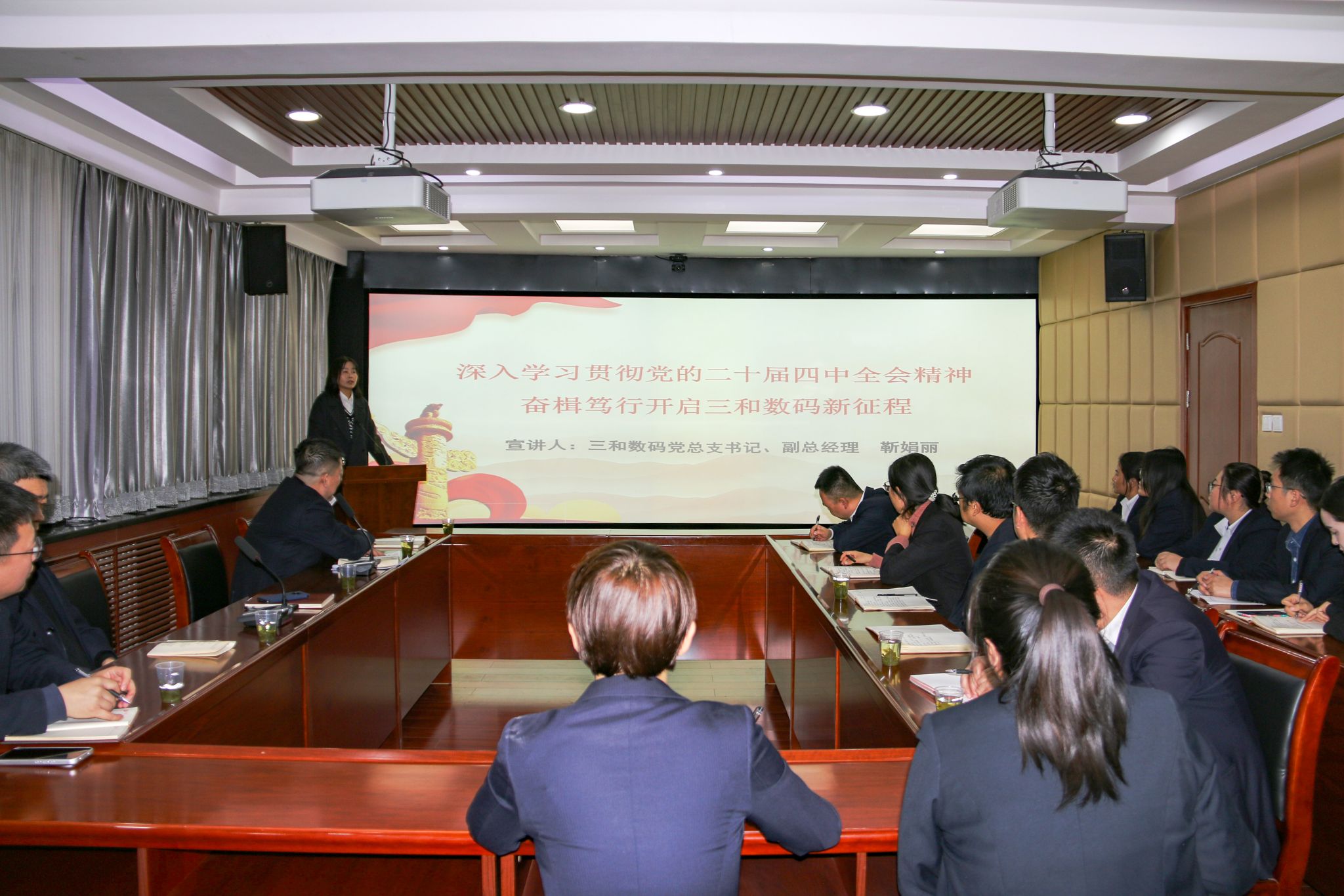 三和数码党总支深入学习贯彻党的二十届四中全会精神宣讲团在党总支书记、副总经理靳娟丽带领下,围绕《深入学习贯彻党的二十届四中全会精神,奋楫笃行开启三和数码新征程》做了专题党课。提出党的二十届四中全会精神如同一座明亮的灯塔,为三和数码的发展指明了方向。深入学习贯彻党的二十届四中全会精神,不仅是企业政治责任的体现,更是推动企业高质量发展、开启全新征程的强大动力。